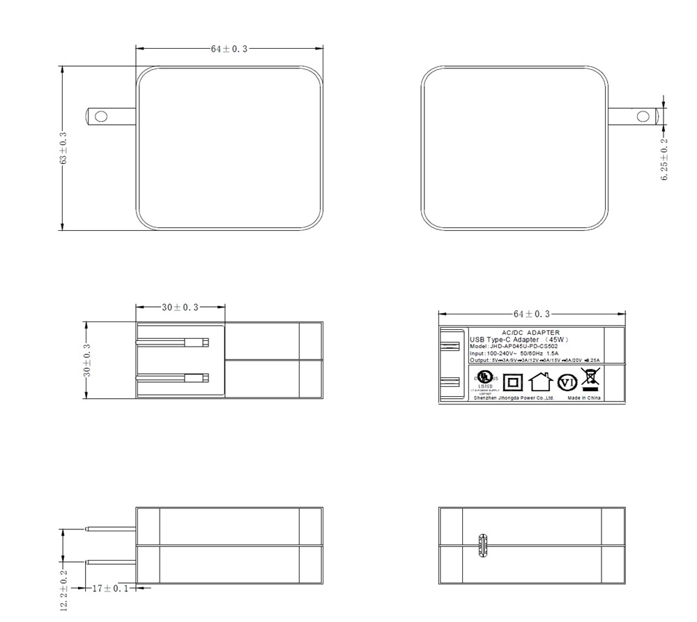型号:JHD-AP045U-PD-CS502, 输出:5V3A,9V3A,12V3A,15V3A,20V2.25A。通过UL,FCC,PSE,CCC,CE,VI,ROHS等认证;美规UL,FCC认证45W-PD充电器,USB-C快速充电器,45W USB Power Delivery快充协议充电器。